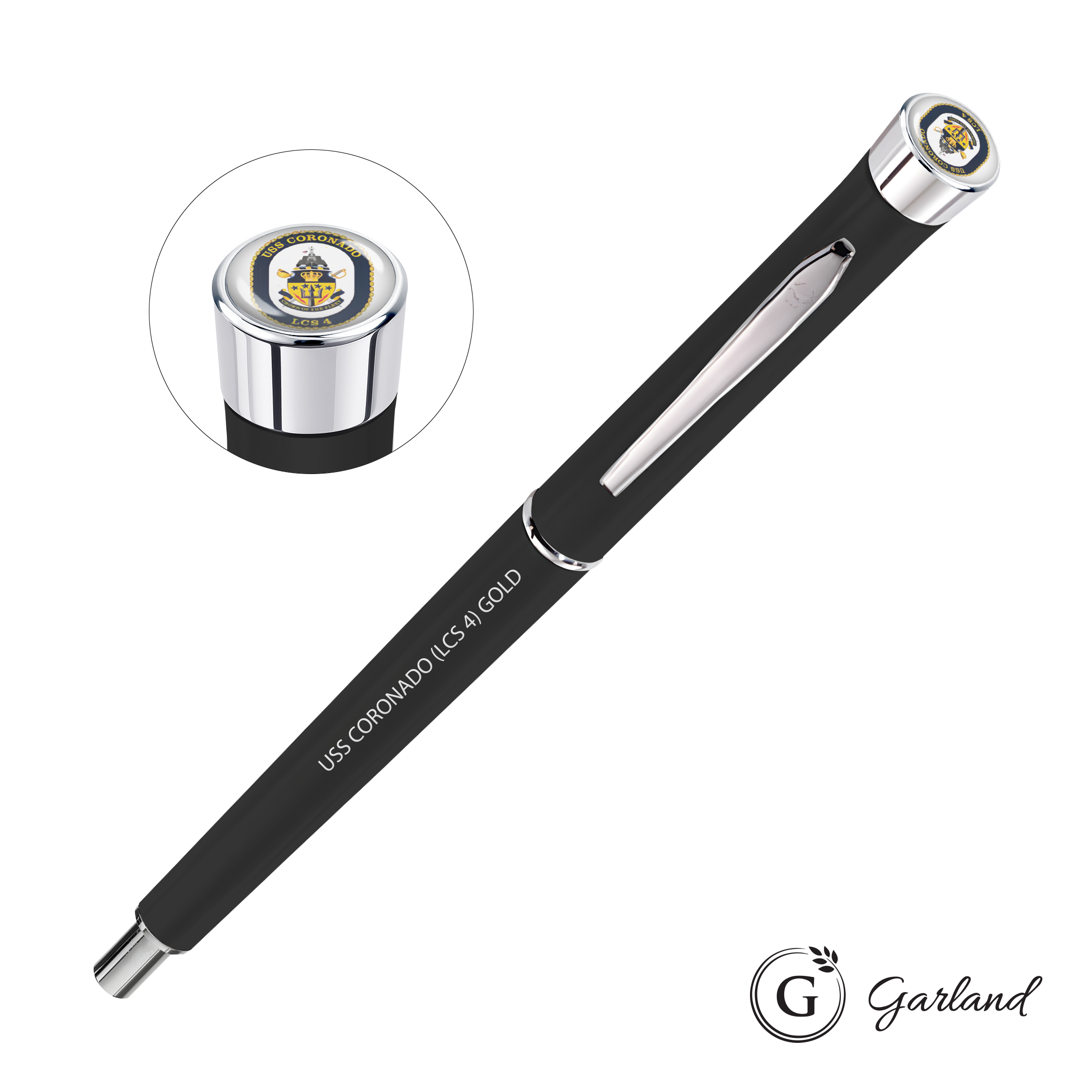 Our best selling chrome accented collection offers a sleek matte finish and variety of color options. Available in ballpoint, rollerball, 0.7mm mechanical pencil and rollerball/pencil set. Your purchase includes a high resolution, CMYK logo dome top and one location laser engraving. Since 1926, Garland pens have been crafted with brass internal components, guaranteed for life, and beautifully presented in an individually packaged soft-touch tuck box. Pen Size: 5.4" W x 0.475" H