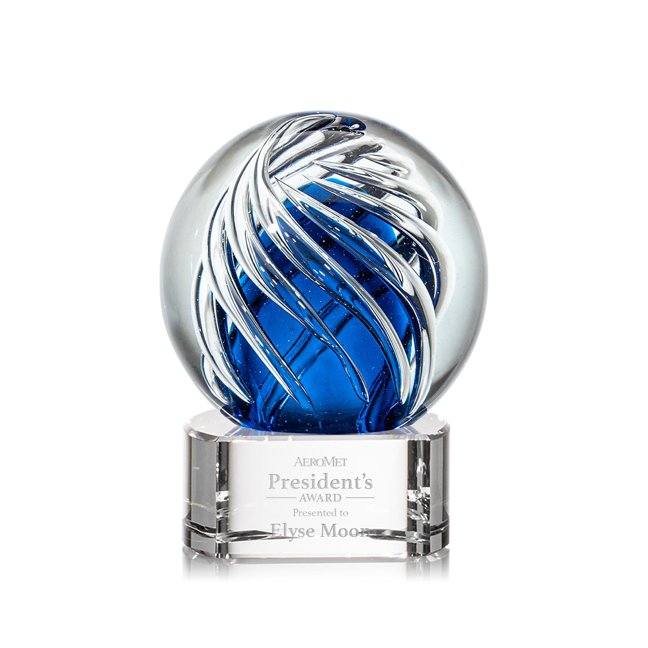 The Genista art glass awards on a Paragon base feature twisting clear swirls wrapped around an opulent sapphire center for a radiant display of achievement recognition. Available in clear, black and blue bases. Other base options available.