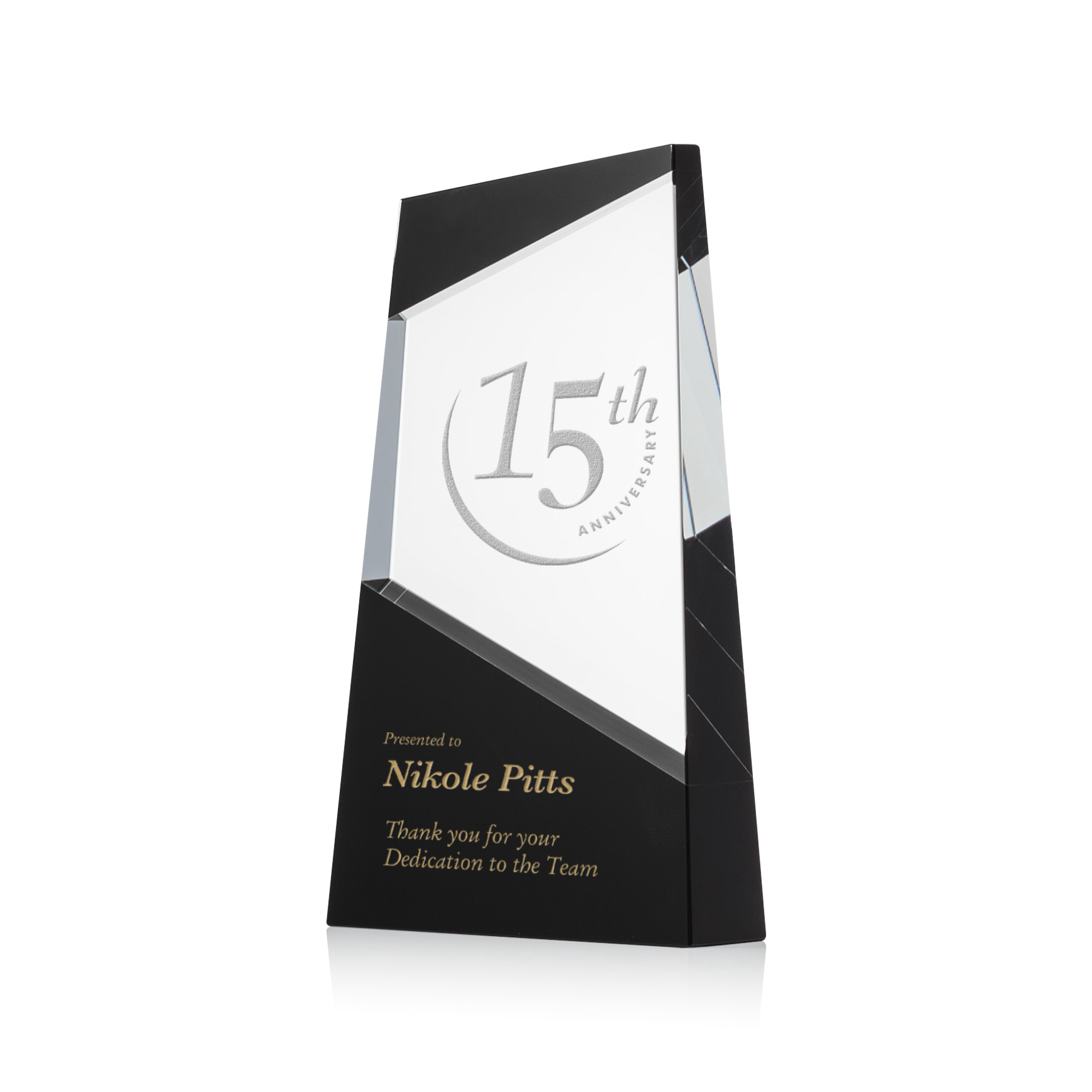 The Amstel Award combines ebony and clear optical crystal in this sharply angled sculpture to highlight your accomplishment with contemporary flair. Second position Deep Etch & Colorfill included.