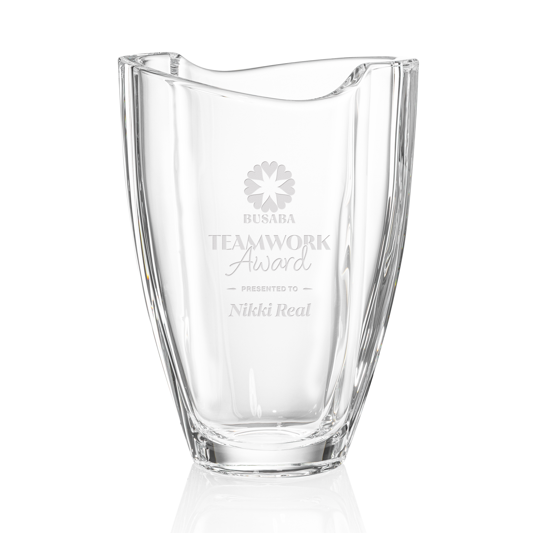 The lead-free crystalline Ainsley Vase features a graceful silhouette with a curved body and a stylish waved design at the opening. Its elegant shape makes it a striking centerpiece for floral arrangements or decorative displays.