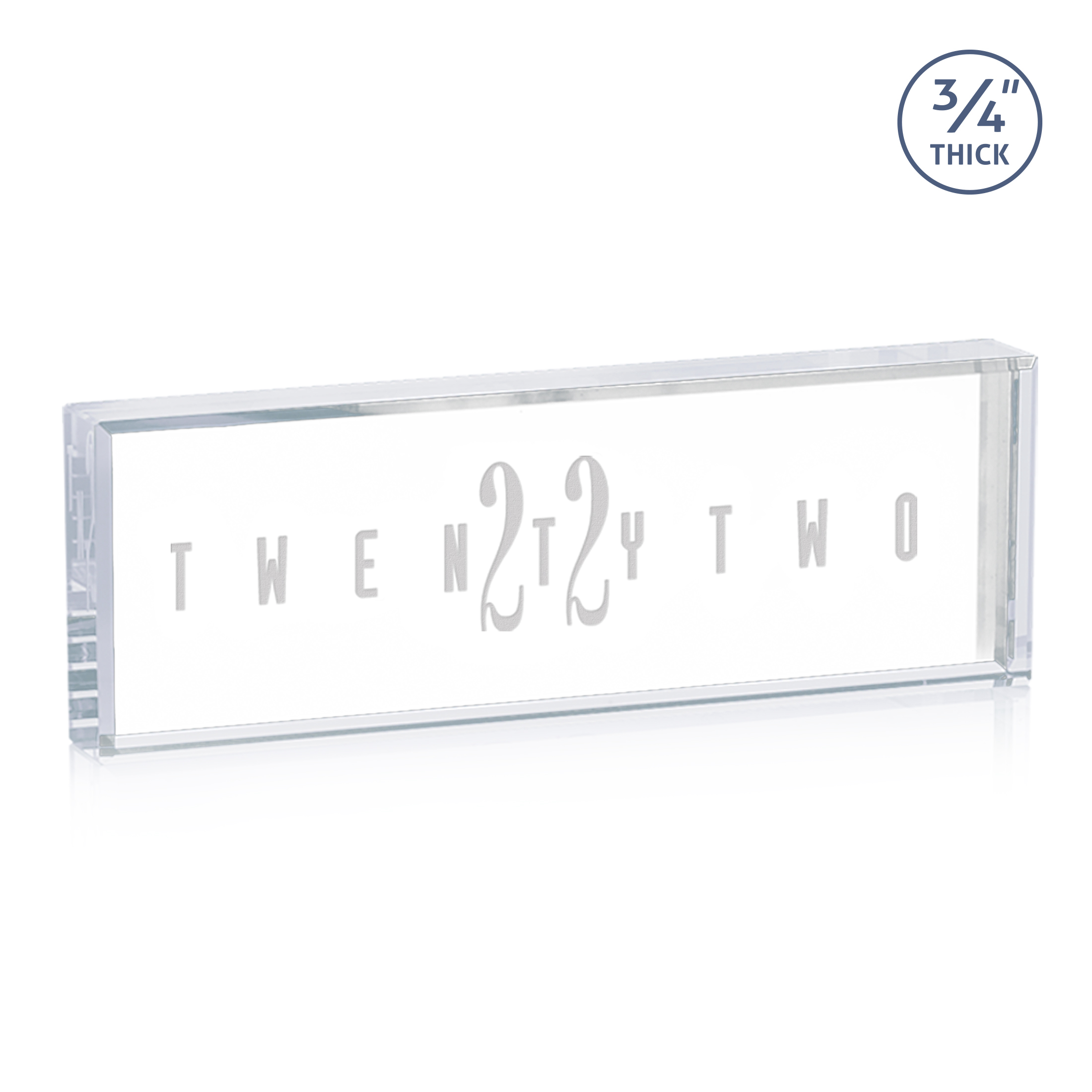 The Lancaster Nameplate is crafted from premium Starfire Crystal, offering exceptional clarity and a sleek, modern look. With a solid 0.75" thickness, it delivers a substantial, high-end presence ideal for desks, offices, and recognition displays. Precision-polished edges enhance brilliance, while the flat crystal face provides a clean canvas for customization. Available with Deep Etch engraving for a timeless finish or Full Color VividPrint™ for vibrant, eye-catching designs. A freestanding design ensures stability and elegance in any professional setting.